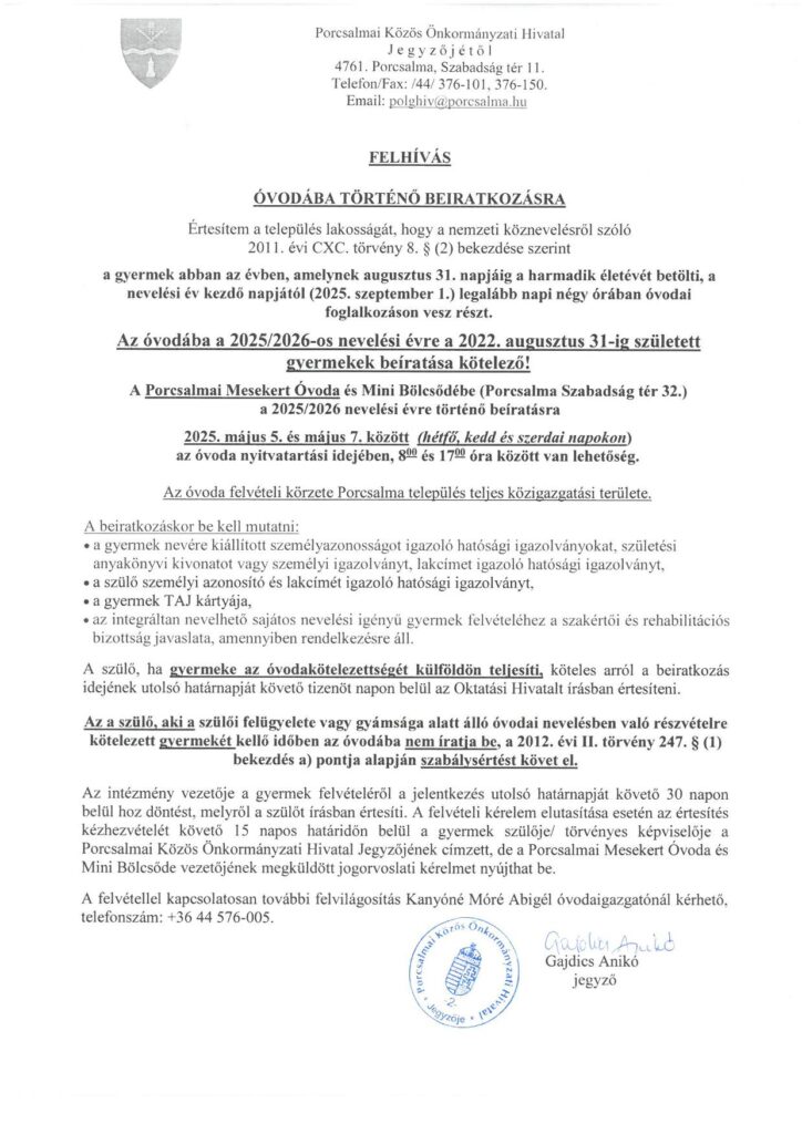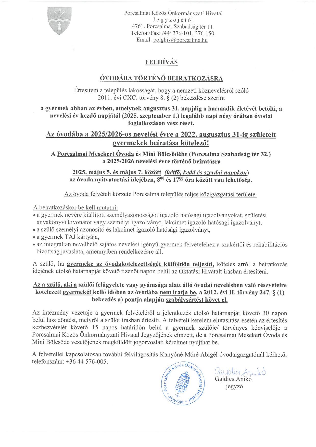 Felhívás óvodába történő beiratkozásra 2025/2026-os nevelési évre