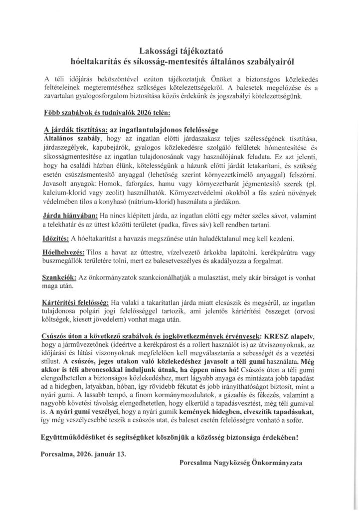 Lakossági tájékoztató hóeltakarítás és síkosság-mentesítés általános szabályairól 2026-01-13 admin Friss hírek 0 0