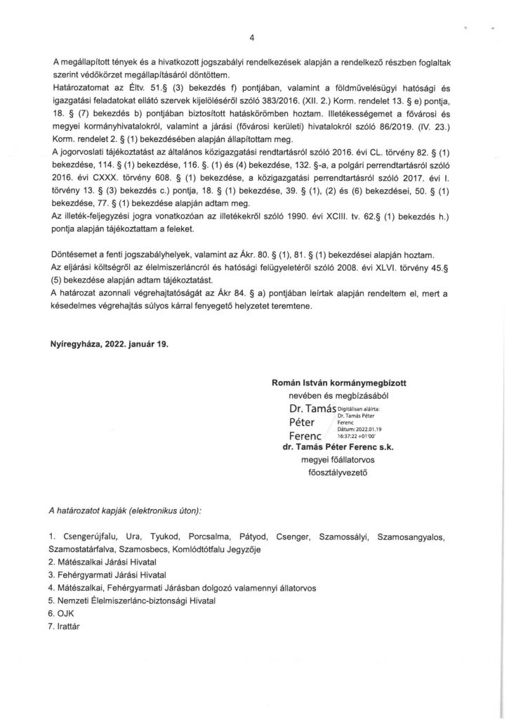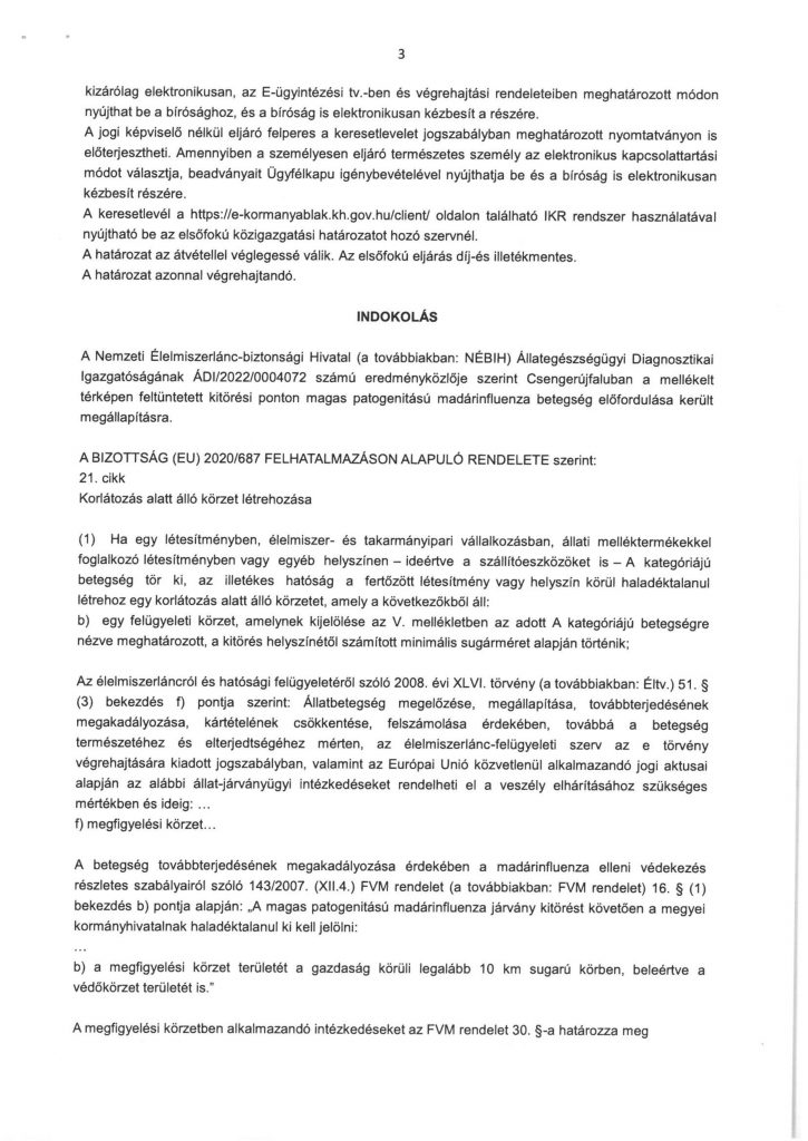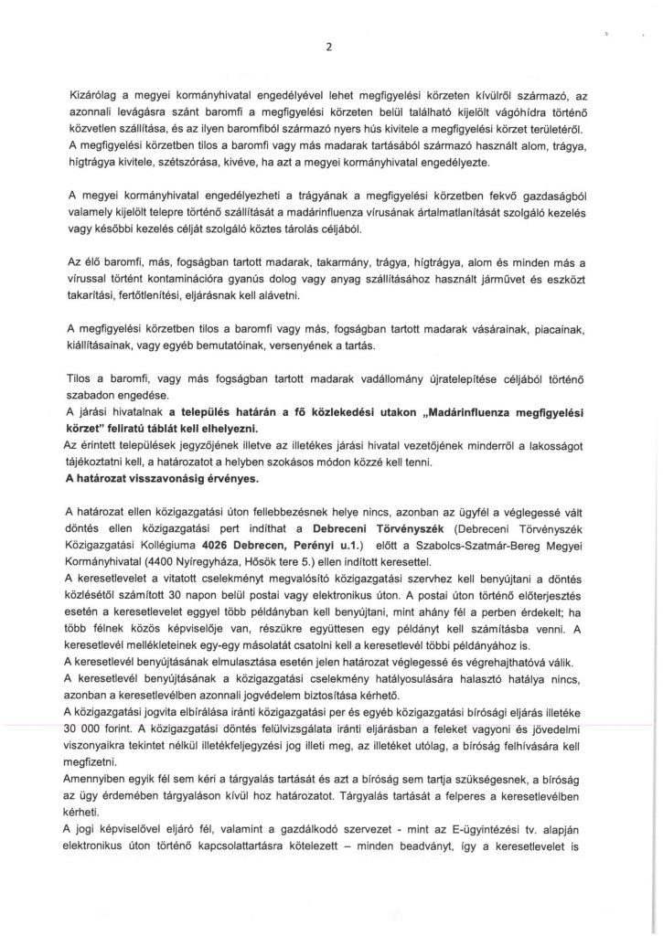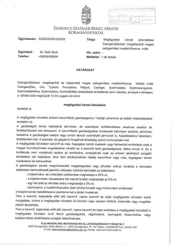 Megfigyelési körzet elrendelése Csengerújfaluban megállapított magas patogenitású madárinfluenza miatt